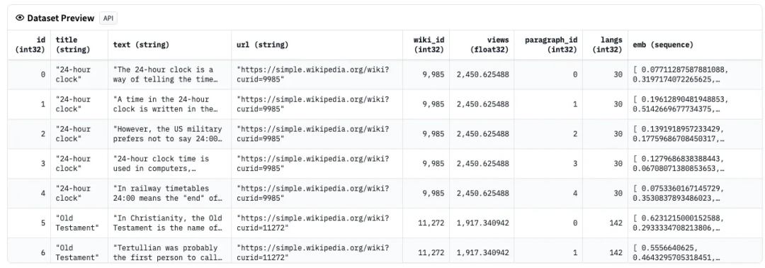我们使用的数据集中已将维基百科(Wikipedia)的文章通过 Cohere Embedding 模型转换为 Embedding 向量。该数据集可通过HuggingFace免费获取(https://huggingface.co/datasets/Cohere/wikipedia-2023-11-embed-multilingual-v3)。