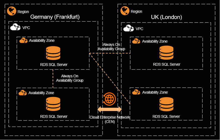 实现德国法兰克福和英国伦敦之间的网络互通,提供低延迟、高速率的网络传输,以满足实时数据同步的网络需求;灾备数据一致性方面,通过应用SQL Server Always On可用性组读取缩放能力