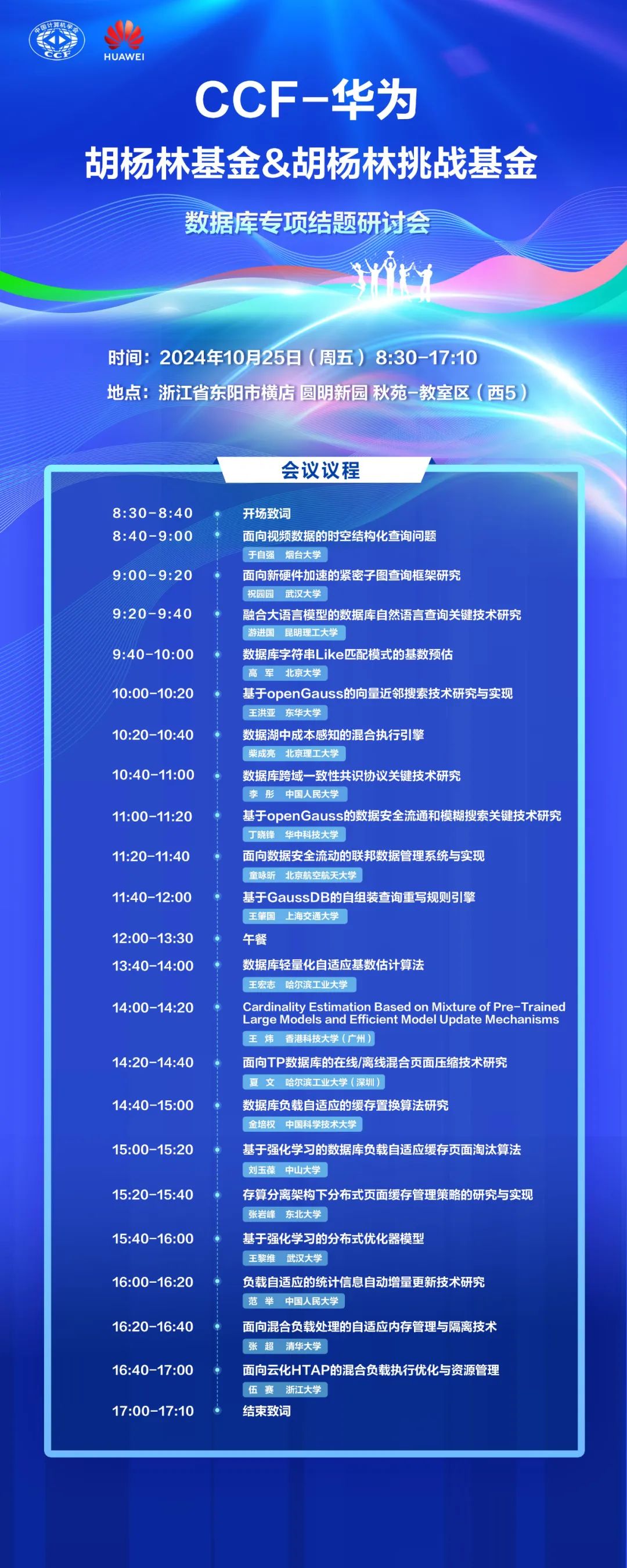 CCF-华为胡杨林基金&胡杨林挑战基金数据库专项结题研讨会作为CNCC2024的重要专题论坛,将于10月25日8:30-17:10,在浙江省东阳市横店圆明新园秋苑-教室区(西5)开展。本次大会邀请了20位专家学者,围绕2023年度20个研究创新型项目交流并结题评优。议题覆盖云原生数据库、大模型数据管理、数据安全隐私、新型数据库等前沿技术方向。届时将通过Gauss松鼠会B站和视频号同步直播,欢迎大家准时观看~