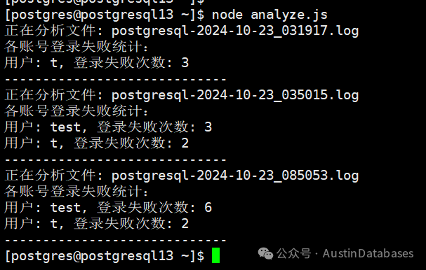 这个脚本通过node.js,加上fs文件模块,来对我们的PostgreSQL中的日志进行分析,通过文件中发现连续的登陆错误的信息,或者黑客尝试暴力破解的信息。通过脚本可以分析出每个数据库账号在一个日志中登陆失败的次数,通过这个来发现异常。他会分析日志中到底发生了多少次以用户登录失败,且主要原因是因为密码错误的问题导致的登陆失败,且在日志中连续5次的密码登陆失败,将会在日志中提出警告,引起管理人员的注意。