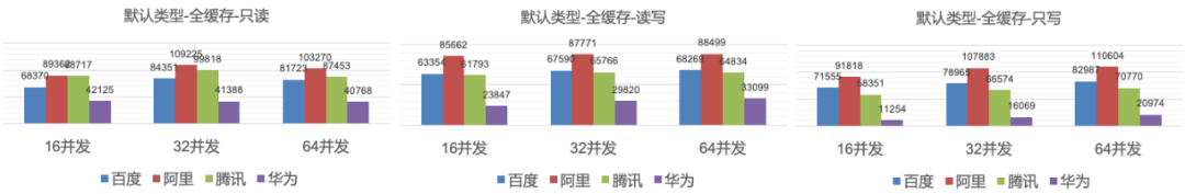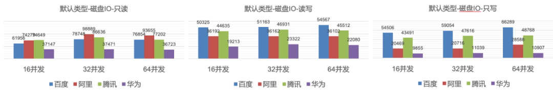 测试结果来看,百度智能云磁盘IO读写、只写场景均有优势;阿里云全缓存场景优势比较明显;腾讯云只读场景优于百度云,读写与只写场景弱于百度智能云;华为云的表现有点奇怪,各个场景均弱于其他竞品,写场景性能差距明显。