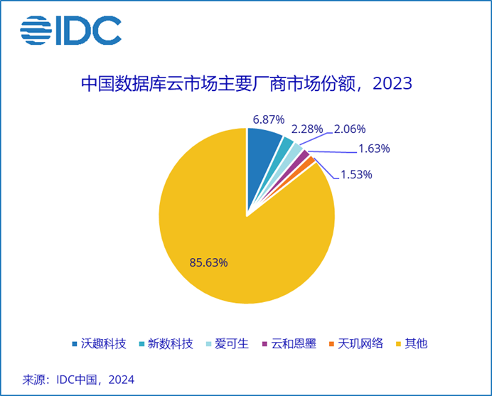 报告显示,在中国数据库云市场中,中国数据库云市场整体规模从 2022 年的 18.4 亿元人民币增长至 2023 年的 20.9亿元人民币,实现了 13.6%的年度增长率。沃趣科技则以6.9%的市场份额占据行业首位,且相比2022年同比增速超20%,增长潜力巨大;