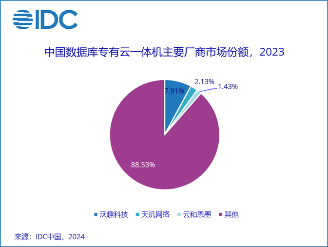数据库专有云一体机2023 年整体市场规模为15.1 亿人民币,年增长率为15.0%,占整体数据库云市场 72.0%的市场份额,作为国内首家发布数据库专有云一体机的厂商,沃趣科技以7.9%的市场份额位列行业第一。