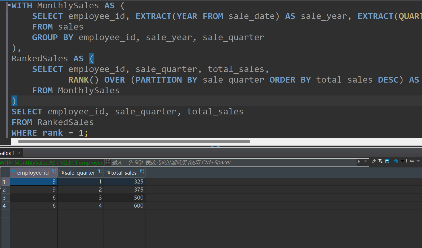 在这个查询中,我们使用WHERE子句来过滤出排名为1的记录,即每个季度的销售冠军。