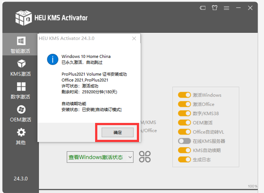 11.激活成功后点击“确定”(提示:如果长时间未激活成功,关闭杀毒软件和系统防护设置重新打开激活即可。)