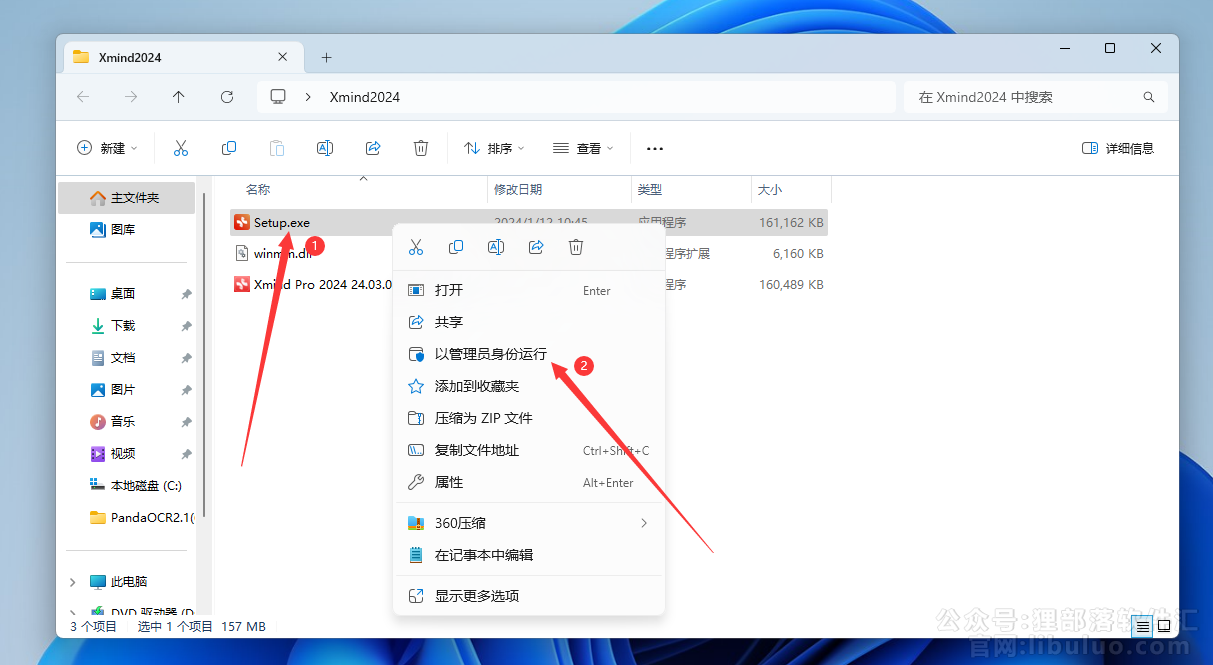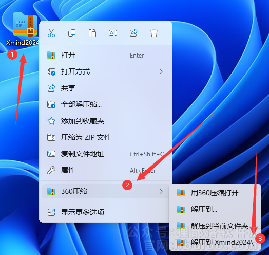 1.解压安装包:①鼠标右击【Xmind2024】压缩包②选择电脑上安装的解压软件(如:360压缩)③点击【解压到 Xmind2024】。