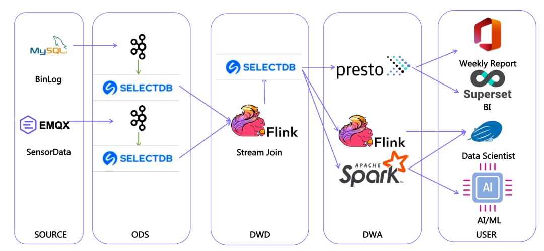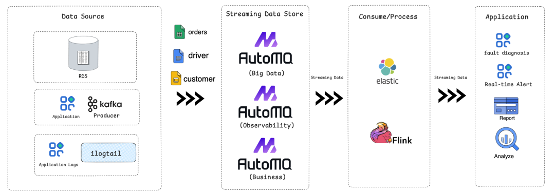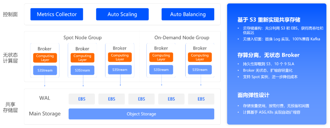 原生 Kafka 存算一体架构下面临迁移数据慢、扩缩容风险高、数据链路长、存储成本大等问题,而 AutoMQ 可以代替 Kafka 构建存算分离的数据处理架构,面向弹性设计易扩展、支持无状态 Broker 且内置流式数据入湖方案,全面满足车企海量数据处理、多租户隔离、跨集群无感迁移等实际应用需求。