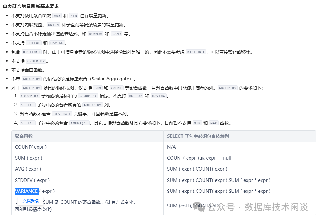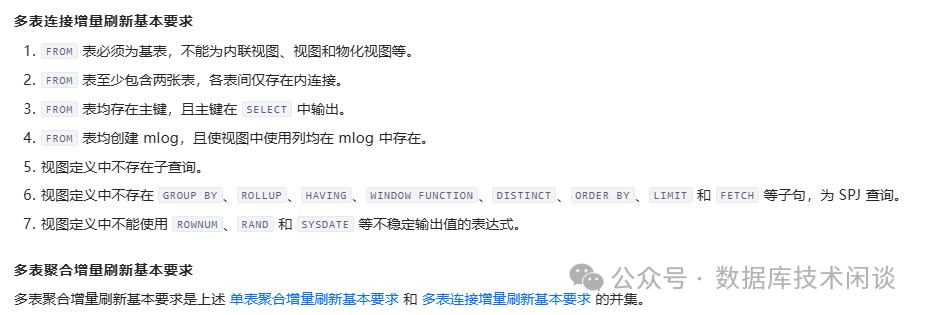 此外,视图也往往有多表连接,增量刷新对视图查询中表连接用法也是有要求的。比如说要求必须是基于表的连接,表要有主键,多表之间是内连接等等。具体限制也看官网文档。