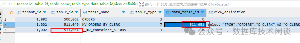 如果感兴趣的话,还可以顺便把这个物化视图对应的内部表一起查出来。下面方法需要在 sys