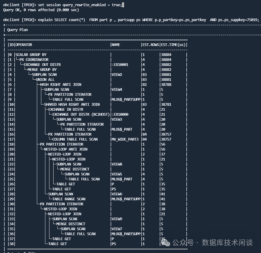 初步看这个执行计划非常复杂,实际上也比较有特点,就是基表的物化视图日志跟基表和原视图之间的各种连接过滤实现数据增量应用到物化视图上。 这就是实时物化视图的优点。