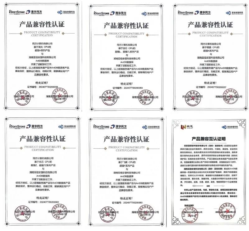 亚信安慧AntDB数据库作为一款企业级高性能数据库,以其原生分布式架构,服务于超过数亿用户,支持PB级存储,为通信、金融、交通、能源等关键行业提供完整工具和服务,已成为推动企业数智化转型的重要力量。清华同方作为国内领先的信息技术解决方案提供商,以其高性能、高可靠性和高兼容性,为政企用户提供了强大的数据处理和存储能力。此次AntDB数据库与基于鲲鹏CPU的超强K系列产品、基于海光CPU的超强H系列产品、基于龙芯CPU的超强L、超强TL系列产品 、基于飞腾CPU的超强F系列产品 、基于兆芯CPU的超强Z、超强TZ系列产品完成了兼容性互认证。凝思软件作为国产安全操作系统的领先厂商,基于其自主研发的安全内核,为底层软件系统提供安全支持。凝思软件产品广泛应用于电力、轨道交通、军队、科研院所和政府机关,以其高可用性和高可靠性,保障关键业务系统的平稳运行。此次,AntDB数据库与凝思安全操作系统6.0产品完成了兼容性互认证。亚信安慧AntDB数据库与清华同方、凝思软件的产品兼容性互认证,将持续深化信创产业发展,推动行业数智化转型,为用户提供更加安全、可靠、高效的数据服务。