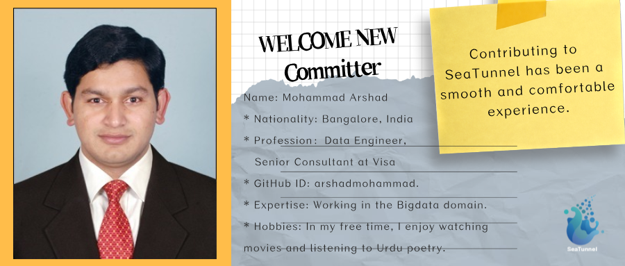 名字:穆罕默德·阿尔沙德(Mohammad Arshad) 国家:印度 班加罗尔 职业:Visa 公司数据工程师(高级顾问级别) GitHub ID:arshadmohammad 专长:大数据领域工作经验 爱好:空闲时间喜欢看电影和听乌尔都语诗歌