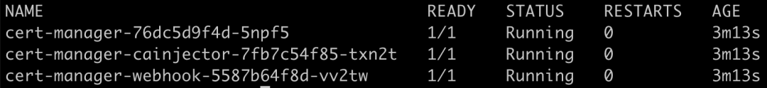 安装完成后,通过执行以下命令验证 cert-manager pod 是否正在运行: