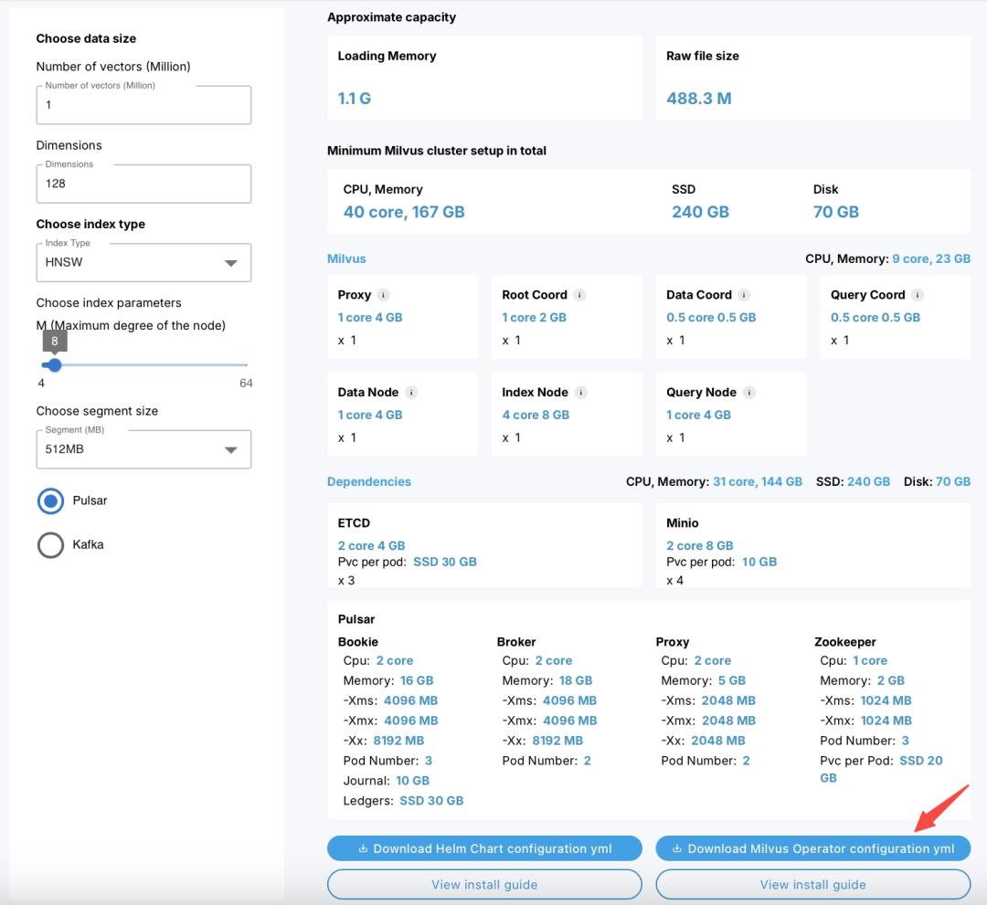 如需自定义 Milvus 设置,您需要将 YAML 文件替换为您自己的 YAML 配置文件。除了手动编辑或创建文件外,您可以使用 Milvus Sizing Tool 工具来调整配置,然后下载相应的 YAML 文件。Milvus Sizing Tool 工具允许您调整各种设置,如资源分配和存储选项,然后下载包含您所需配置的 YAML 文件。确保您的 Milvus 部署针对您的特定用例进行了优化。