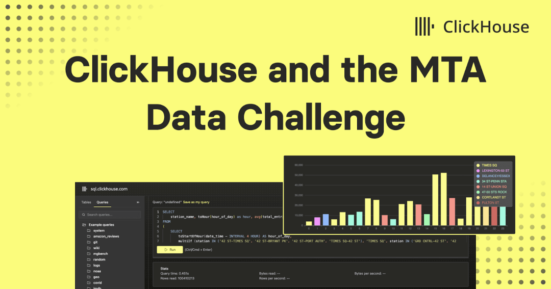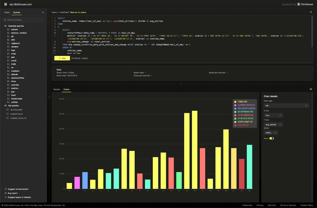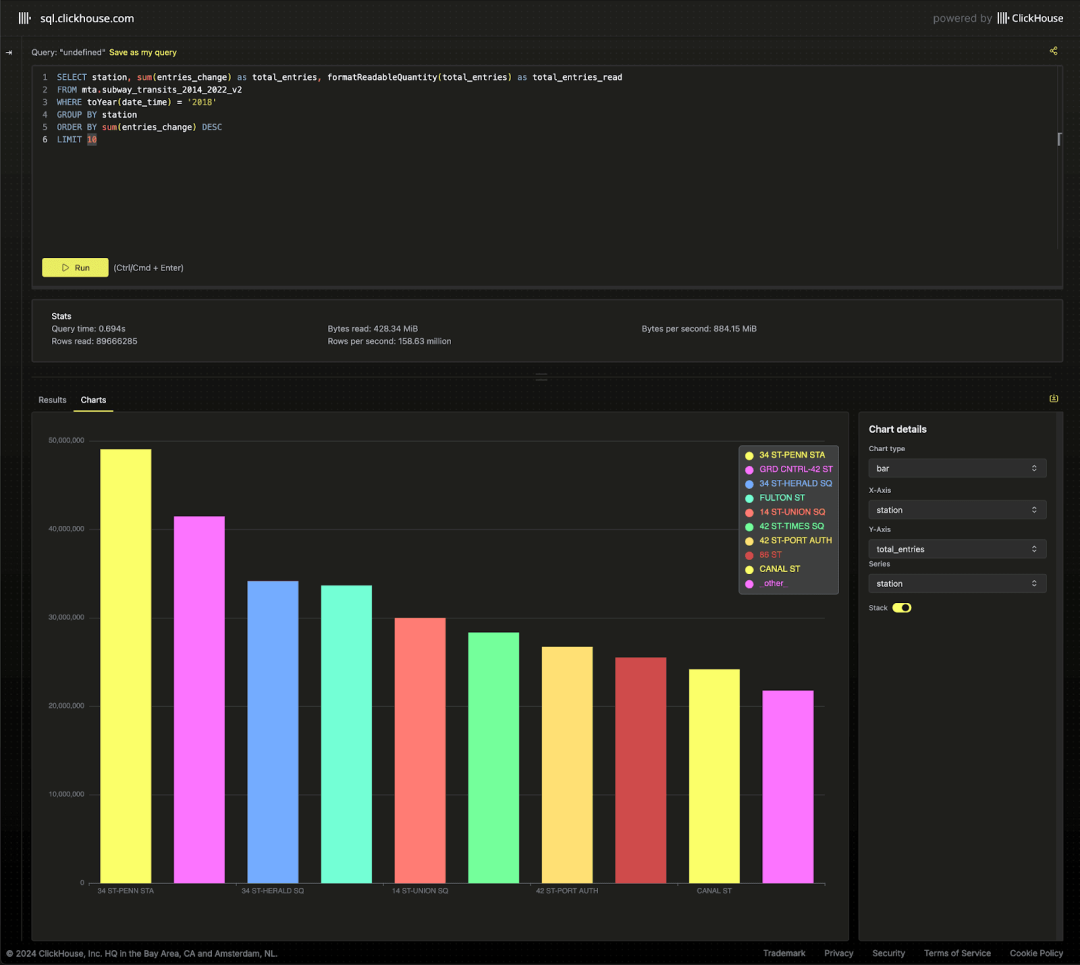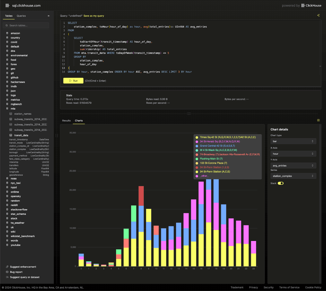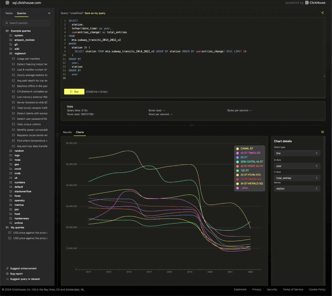对于只关心最终数据集的用户,我们已将其加载到新的 ClickHouse playground,您可以在其中尝试超过 220 个查询和 35 个数据集!如需贡献新的查询和数据集,欢迎访问我们的 demo 仓库。