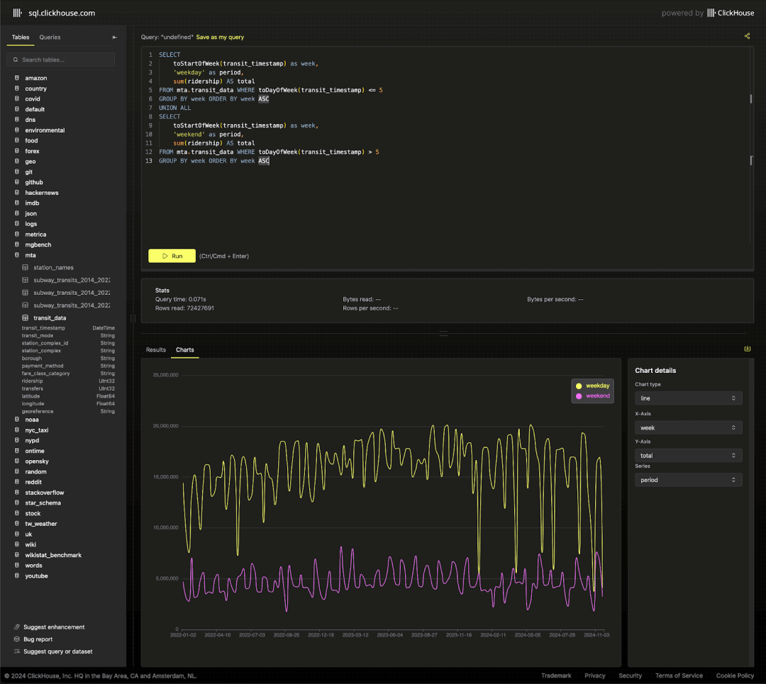 SELECTtoStartOfWeek(transit_timestamp) AS week,'weekday' AS period,sum(ridership) AS totalFROM mta.transit_dataWHERE toDayOfWeek(transit_timestamp) <= 5GROUP BY weekORDER BY week ASCUNION ALLSELECTtoStartOfWeek(transit_timestamp) AS week,'weekend' AS period,sum(ridership) AS totalFROM mta.transit_dataWHERE toDayOfWeek(transit_timestamp) > 5GROUP BY weekORDER BY week ASC