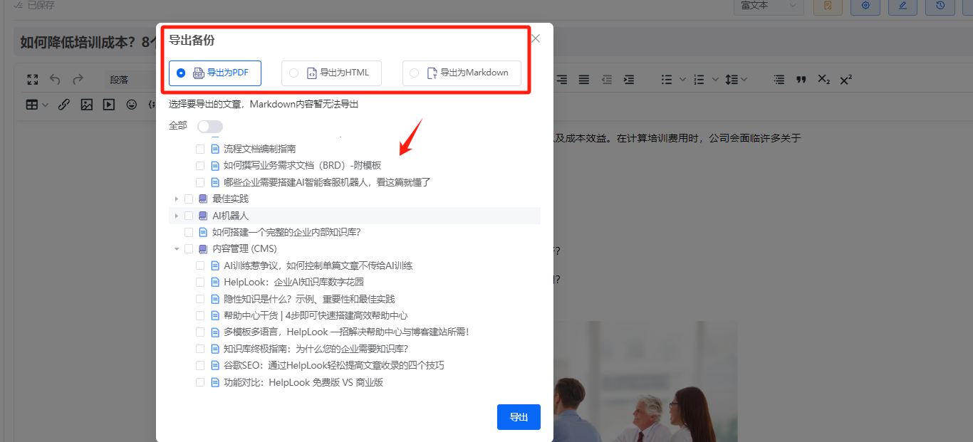 通过清晰的分类和标签体系,知识查找变得轻而易举。同时还能一键导出PDF、markdown、HTML格式,方便企业以不同形式分享或者备份文章。