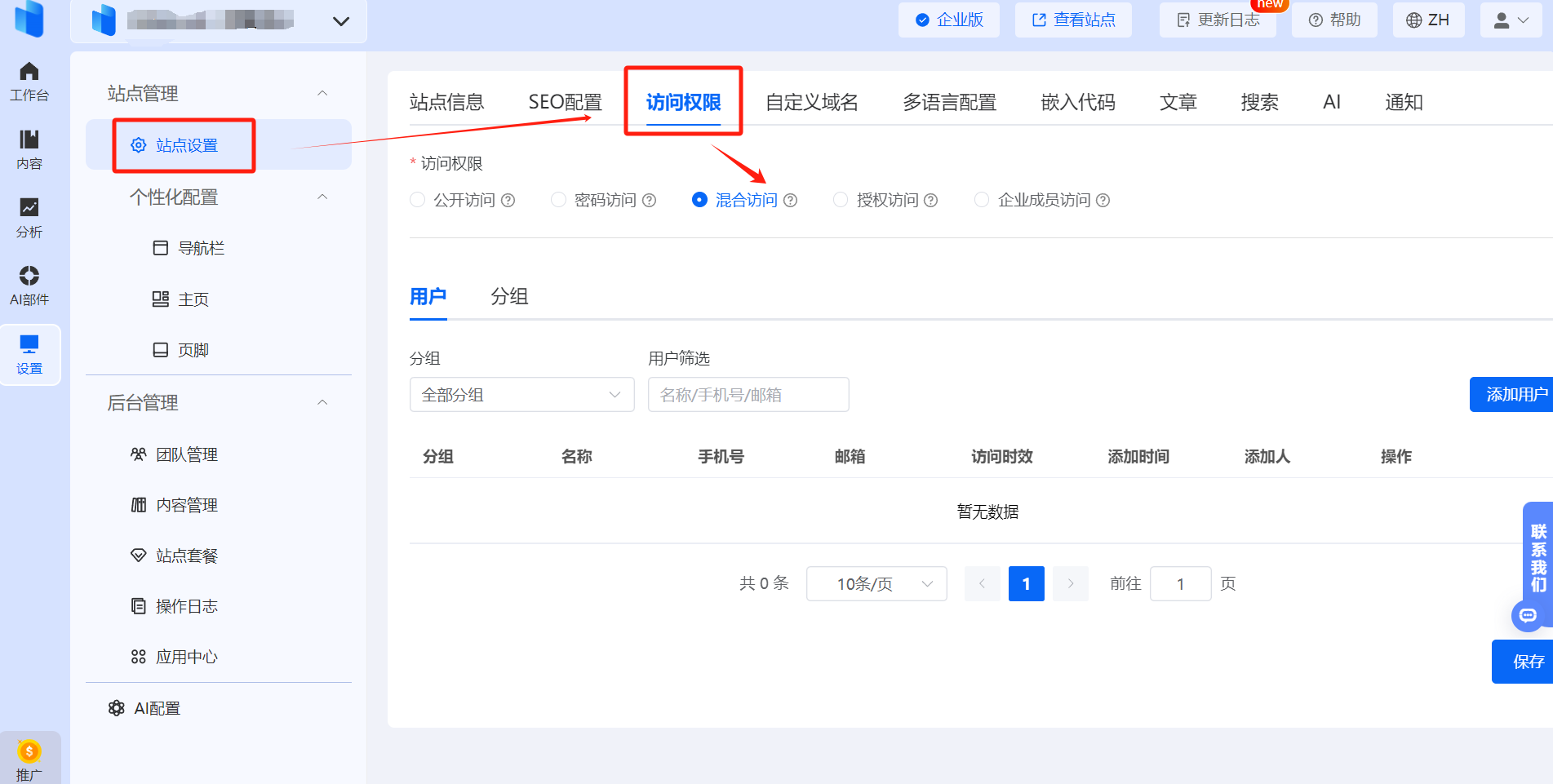 您可以在同一站点内轻松设置多种访问权限,实现混合访问模式。显著提升了信息管理的灵活性和安全性。只需简单几步,即可在页面左侧的站点设置中选择“访问权限”,添加需要配置的用户,并为特定的栏目或文章设置访问权限。例如,如果站点设置为【混合访问】权限,后续按需要配置文档访问权限的用户进来。这里支持分组管理、批量添加、配置访问时效。最后,再给特定用户配置访问权限即可。