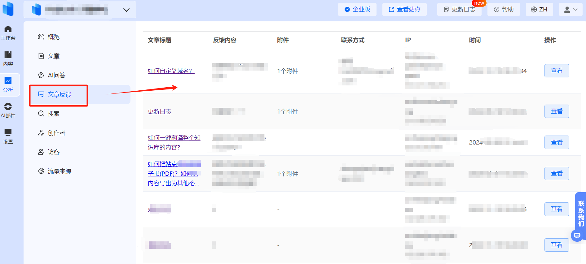 随后,管理员积极收集用户反馈,不断调整和完善帮助中心的内容与结构,确保其始终与用户需求保持同步。点击页面左侧的“分析” → “文章反馈”,即可查看用户提交的文章标题、反馈内容、附件、联系方式、IP、时间、操作。