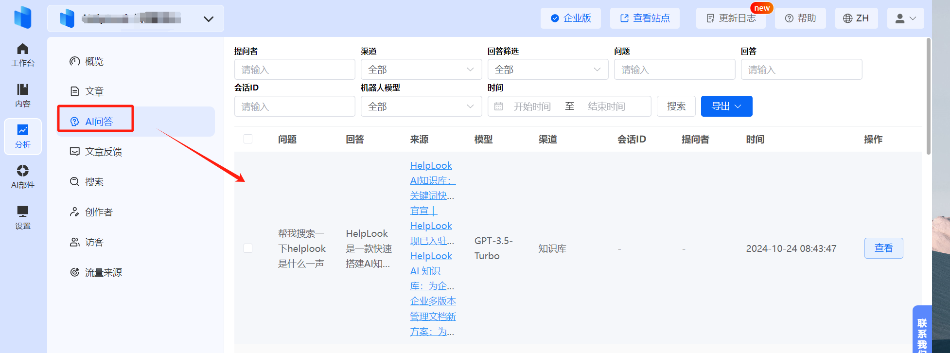 此外,HelpLook AI问答具备智能数据分析功能,通过分析用户的常见问题,可以帮助你深入了解用户需求,精准借鉴关键词设置,提升内容质量。如果是授权了企业组织架构的站点,企业成员提问,问答记录可以看见提问者信息,为企业提供了深入了解用户需求和优化内容。