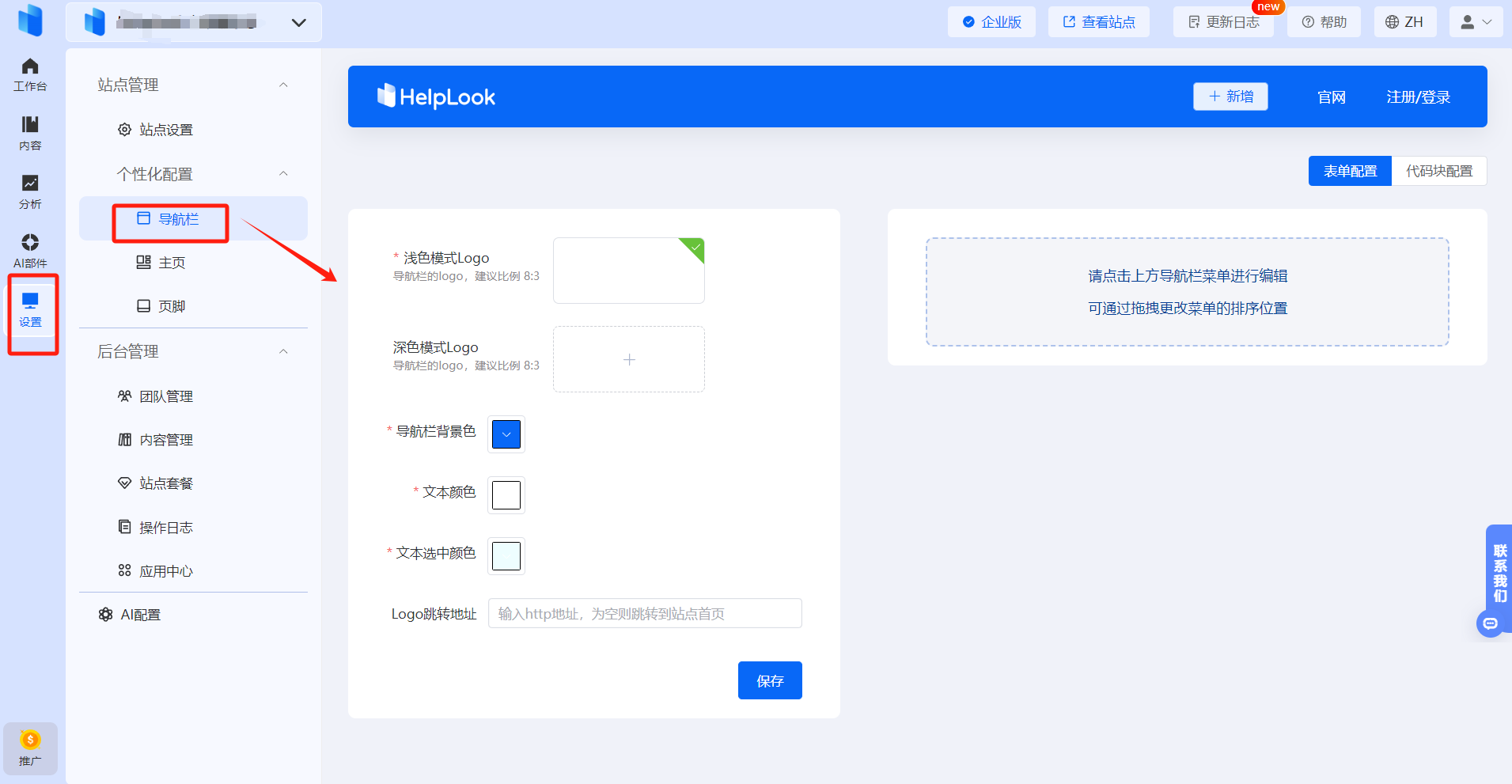 对于新手用户来说,一个层级分明的结构化目录展示(即导航栏)非常重要。它可以告诉用户软件有哪些主要功能、有哪些操作任务、操作任务之间有什么关联等。在HelpLook后台,可以上传导航栏logo、自定义导航栏背景色、文本颜色相关内容,使导航栏更加美观、易用,彰显品牌形象。