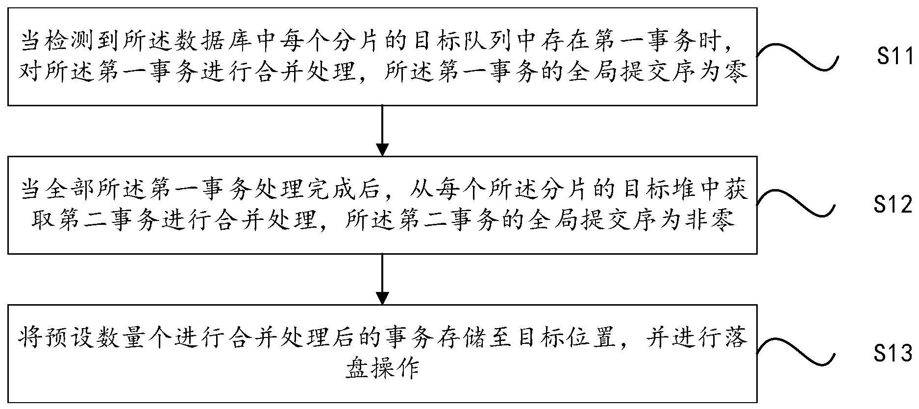 当检测到所述数据库中每个分片的目标队列中存在第一事务时,对所述第一事务进行合并处理,所述第一事务的全局提交序为零;