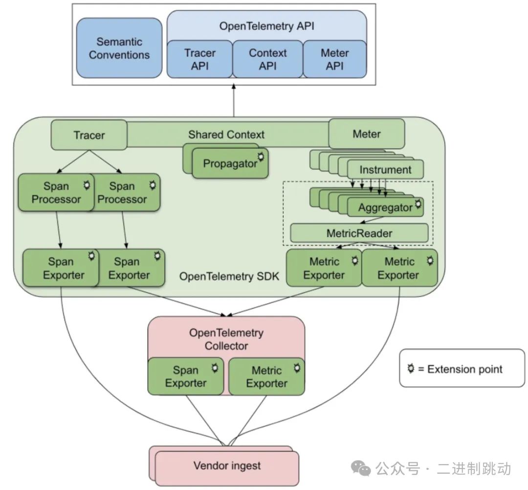 随着行业的发展,三位一体的标准应运而生,即 OpenTelemetry 标准(它集成了 OpenCensus、OpenTracing 标准)。这个标准将 Metrics(指标)、Tracing(追踪)和 Logging(日志)集成于一体,如此一来,我们在监控系统时就可以从三个维度综合观测系统的运转情况。常见的 OpenTelemetry 开源项目中的 Prometheus、Jaeger 正在遵循这个标准逐步改进。OpenTelemetry 实现的结构如下图所示: