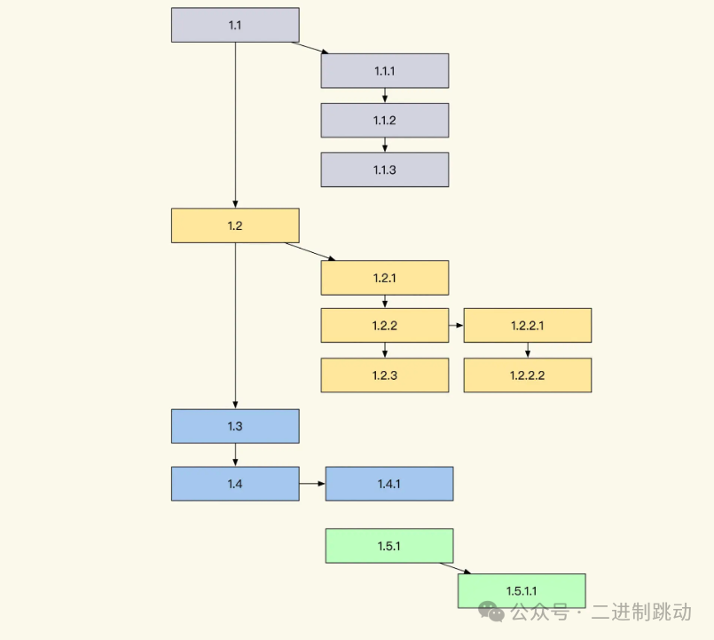 第二个优点是哪怕日志收集得不全,丢失了一些,我们还可以通过前缀有几个分隔符,判断出日志所在层级进行渲染。举个例子,假设我们不知道上图的 1.5.1 是谁调用的,但是根据它的 UUID 和层级 1.5.1 这些信息,在渲染的时候,我们仍旧可以渲染它大概的链路位置。