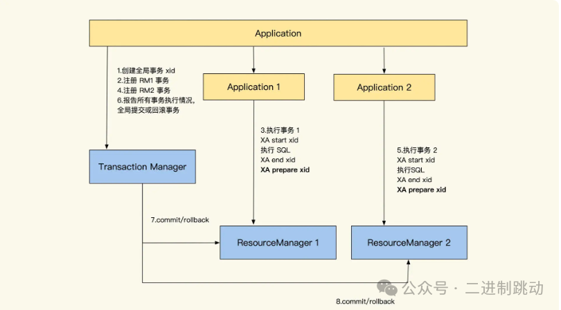 下面我们来看 XA 协调两个事务的具体流程,这里我拿最常见的 2PC 方式为例进行讲解