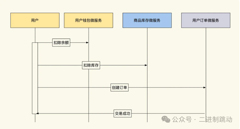 言归正传,我们以购物场景为例,在购物的整个事务流程中,需要协调的服务有三个:用户钱包、商品库存和用户购物订单,它们的数据都放在私有的数据库中。