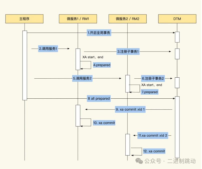 有了子事务的 xid 后,被请求的服务会通过 xid 标识开启 XA 子事务,让 XA 子事务执行业务操作。当事务数据操作都执行完毕后,子事务会执行 Prepare 指令,将子事务标注为 Prepared 状态,然后以同样的方式执行 xid2 事务。所有子事务执行完毕后,处于 Prepared 状态的 XA 事务会暂存在 MySQL 中,即使业务暂时断开,事务也会存在。这时,业务代码请求事务协调器通知所有申请的子事务全部执行成功。与此同时,TM 会通知 RM1 和 RM2 执行最终的 commit(或调用每个业务封装的提交接口)。至此,整个事务流程执行完毕。