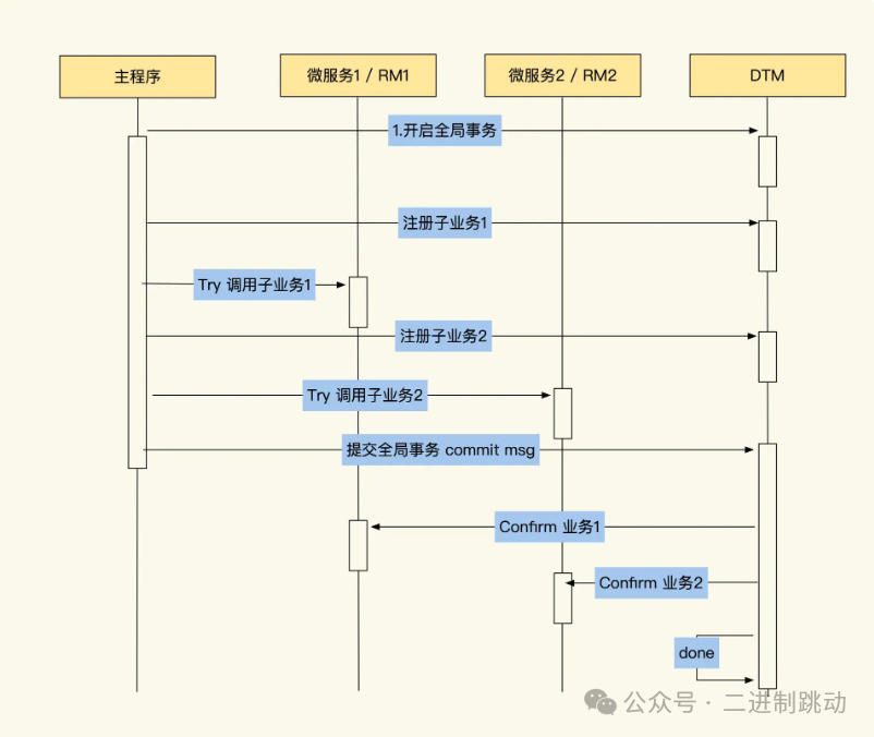 事务协调器(TM):用于创建主事务,同时协调各个子事务。事务协调器会根据各个子事务的执行情况,决策这些子事务最终是提交执行结果,还是回滚执行结果。此外,事务协调器很多时候还会自动帮我们提交事务。