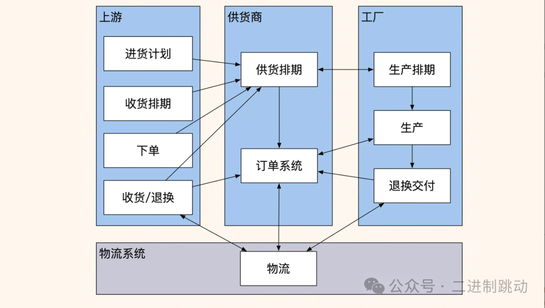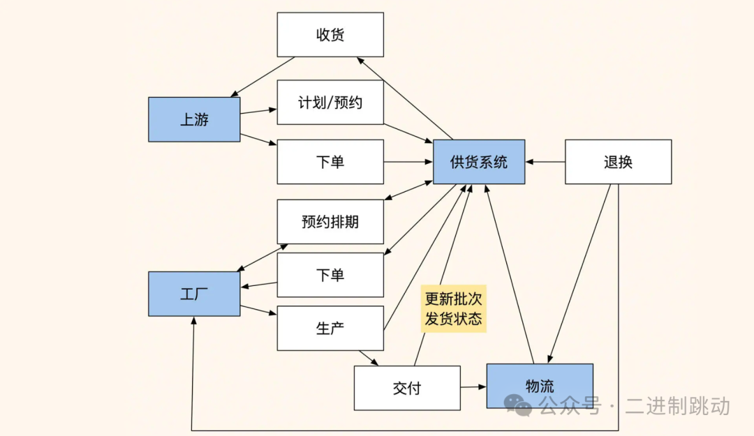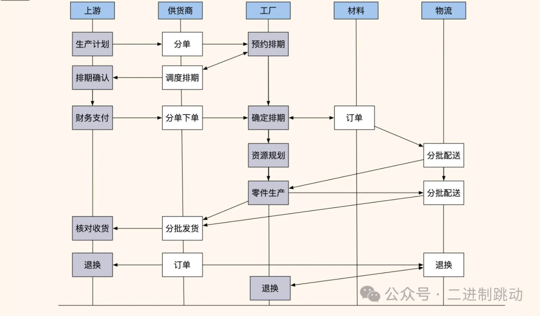 根据这个图,我再次与研发和产品团队沟通,明确了订单与排期在功能和数据上的拆分点。具体而言,上游职能被拆分为:发布进货计划、收货排期、下单、收货/退换;供货商主要负责协调排期分单并提供订单服务;工厂则专注于生产排期、实际生产和售后服务支持。