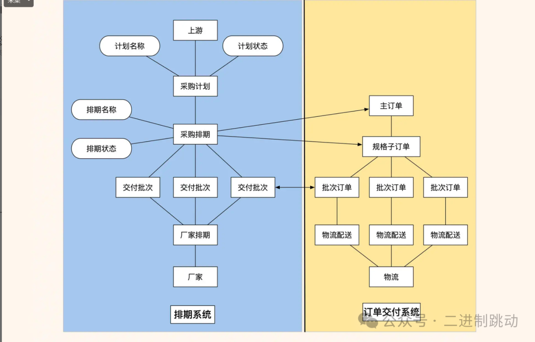 由此可见,前期的排期协调阶段无需订单参与,主要是上游与工厂之间的排期安排;而生产供货和售后阶段则依赖于订单,并且各个角色(上游、工厂、物流)在此环节的关注点不同。基于这种流程划分,我们可以按照主要实体和业务流程(以订单ID为聚合根,将流程拆分为订单和排期两个领域)来构建两个子系统:排期调度系统和订单交付系统。