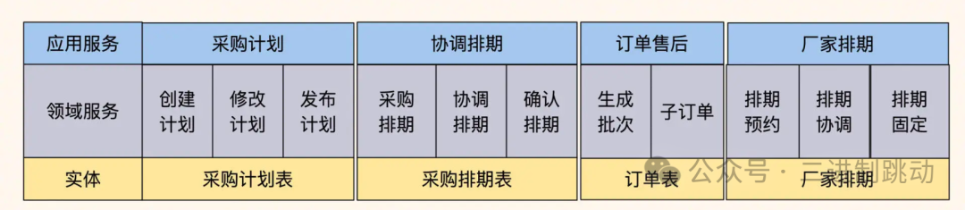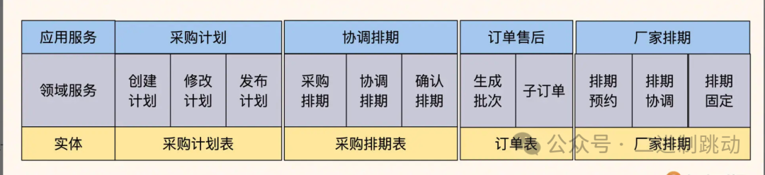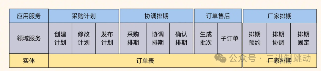 经历了上面的过程,相信你对按流程和阶段拆分实体职责的方法,已经有了一定的感觉,这里我们再用代码和数据库表的视角复盘一下该过程。一般来说,系统功能从表开始拆分,这是最容易实现的路径,因为我们的业务流程往往都会围绕一个主要的实体表运转,并关联多个实体进行交互。在这个案例中,我们将订单表内关于排期的数据和状态做了剥离,拆分之前的代码分层如下图所示: