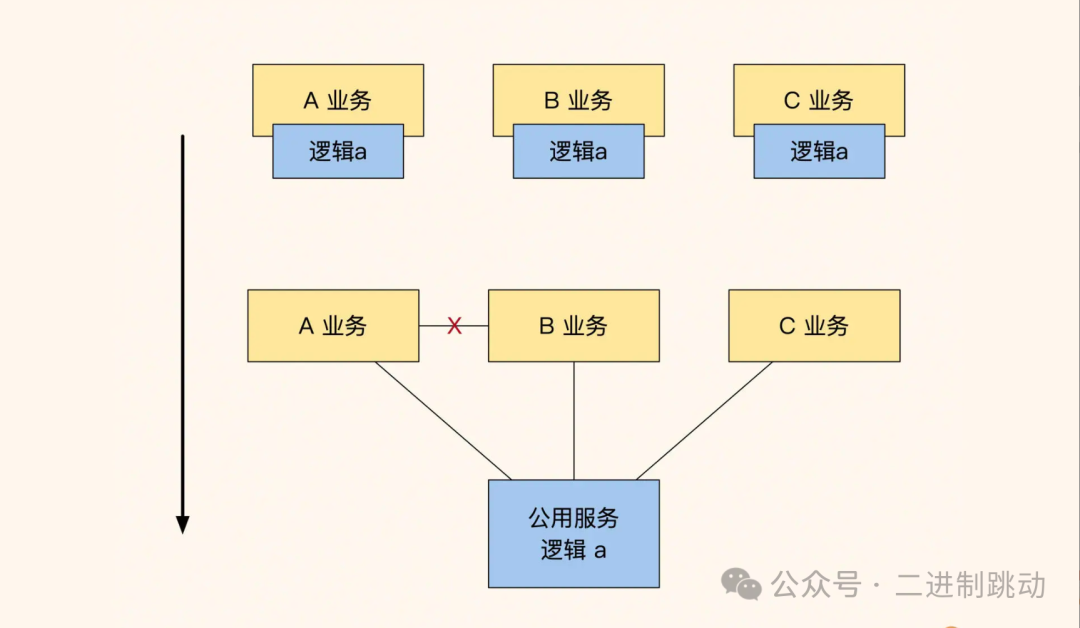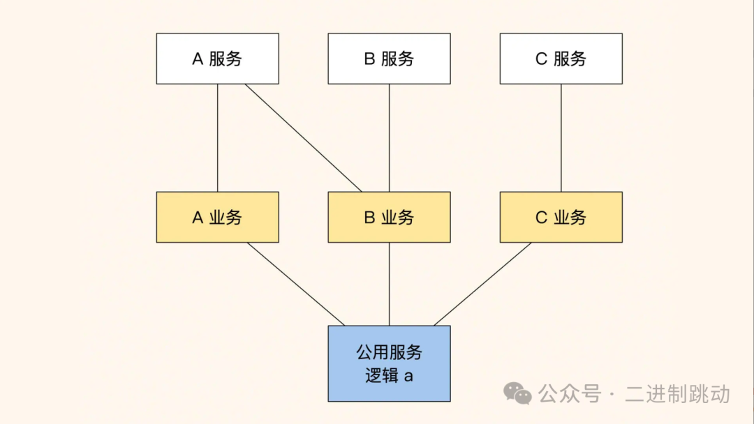 如果两个或多个服务共享同一个业务逻辑,那么可以将这个逻辑抽象为公共服务。例如,如果业务A更新了逻辑a,业务B也需要使用这个新的逻辑a,那么就可以把逻辑a提取到一个底层的公共服务中,供两个服务调用。这种方式属于被动抽象,比较常见,尤其适合代码量较小、维护人员有限的系统。在创业初期,系统主脉络尚不清晰时,采用被动抽象法可以方便地进行抽象。