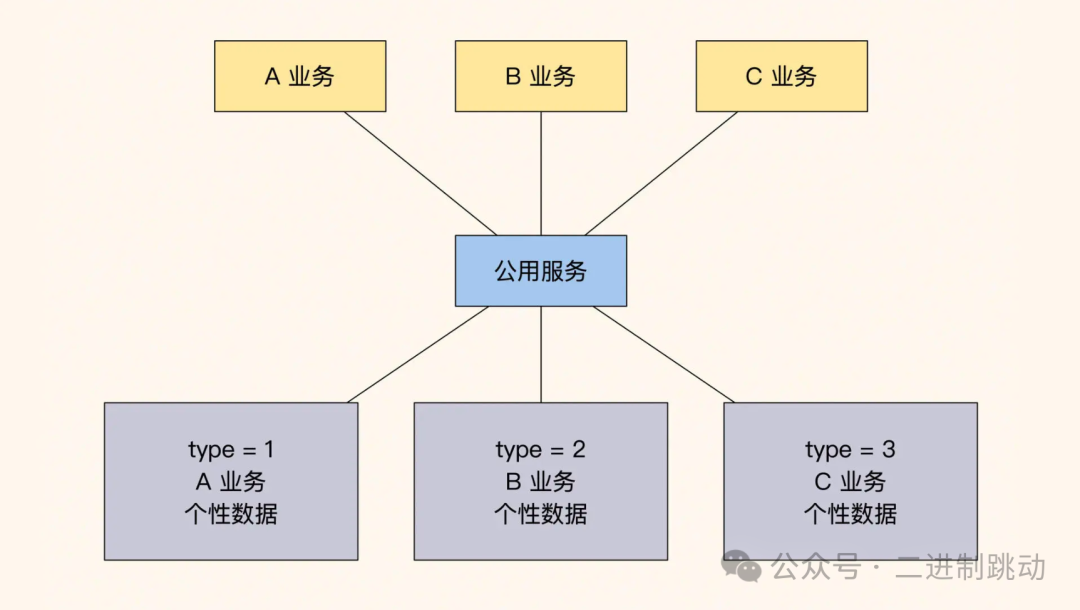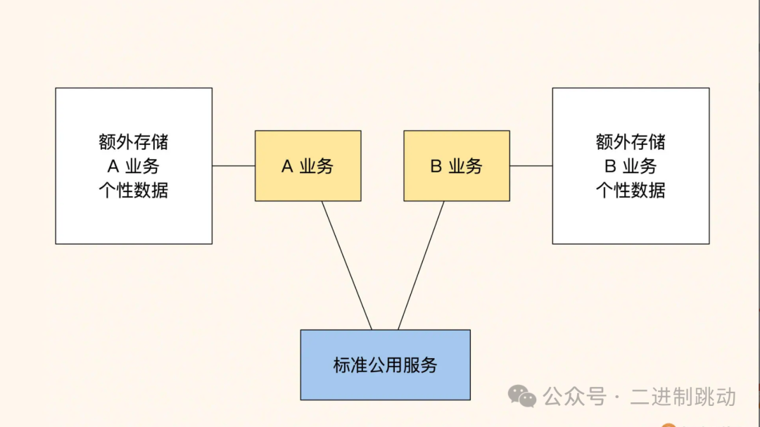 这种方式在大型企业比较常见,其核心点在于:底层服务只做标准的服务,业务的个性部分都由业务自己完成,比如订单系统只有下单、等待支付、支付成功、发货和收货功能,展示的时候用前端对个性数据和标准订单做聚合。用这种方式抽象出的公共服务订单对业务的耦合性是最小的,业务改版时不需要订单跟随改版,订单服务维护起来更容易。只是上层业务交互起来会很难受,因为需要在本地保存很多附加的信息,并且一些流转要自行实现。不过,从整体来看,对于使用业务多的系统来说,因为业务导致的修改会很少。
