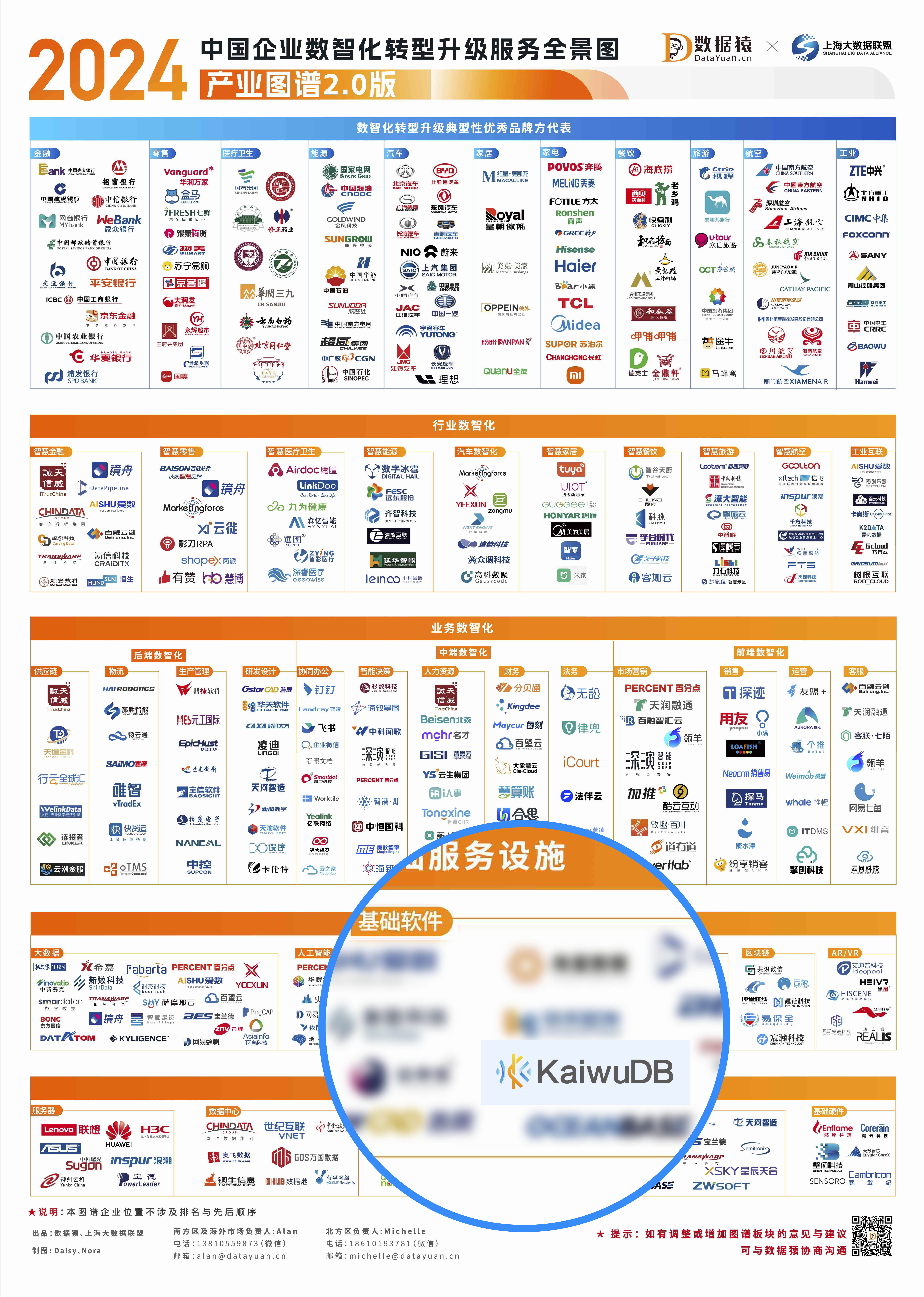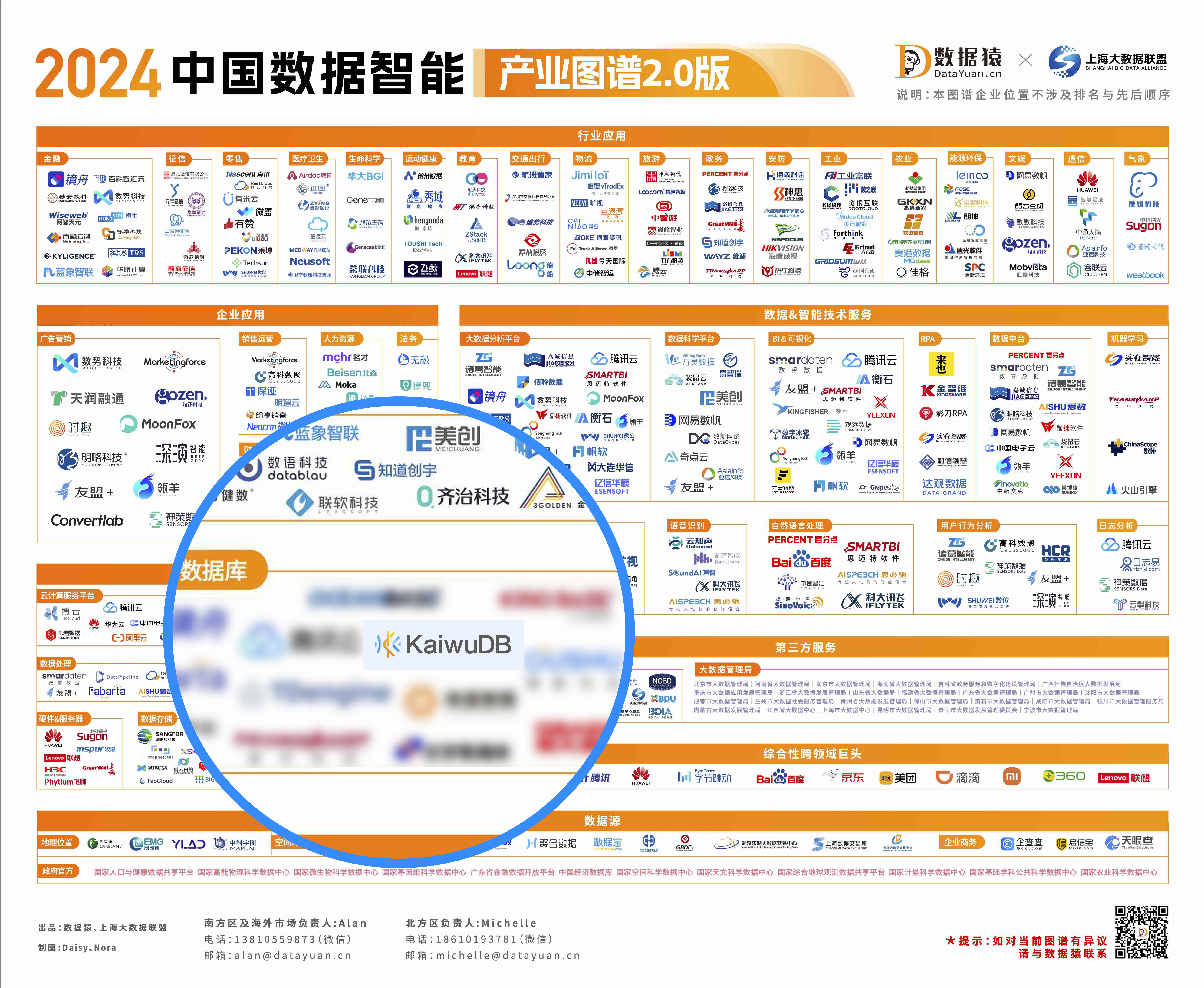 10月,由大数据领域权威媒体数据猿与上海大数据联盟联合出品的《2024中国数据智能产业图谱2.0版》、《2024中国企业数智化转型升级服务全景图/产业图谱2.0版》正式发布,旨在全方位展示我国数据智能、数智化转型最新市场格局、技术趋势、企业动态。KaiwuDB 凭借分布式多模数据库的核心能力,及在智能制造、智慧矿山、数字能源、数字政务等行业领域丰富的落地实践,分别被列为【基础设施-数据库】、【基础服务设施-基础软件】代表企业。