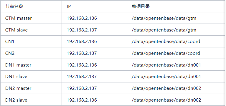 下面以两台服务器上搭建1GTM主,1GTM备,2CN主(CN主之间对等,因此无需备CN),2DN主,2DN备的集群,该集群为具备容灾能力的最小配置