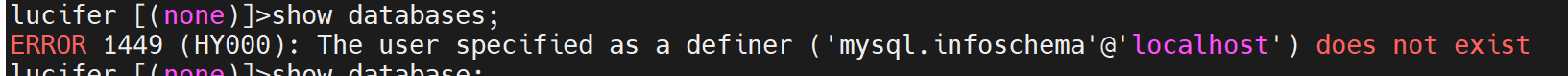 上一次进行mysql5.7升级mysql8.0之后就没有做操作了,然后今天想使用数据库的时候报错提示error 1449 The user specified as a definer ('mysql.infoschema'@'localhost') does not exist,而mysql.infoschema提供的是对数据库元数据的访问,有关 MySQL 服务器,例如数据库或表的名称、数据 type 或访问权限。是每个 MySQL 实例,用于存储有关所有 MySQL 服务器维护的其他数据库。该数据库包含多个 只读表。它们实际上是视图,而不是基表,因此 没有与之关联的文件,并且不能设置 触发器。