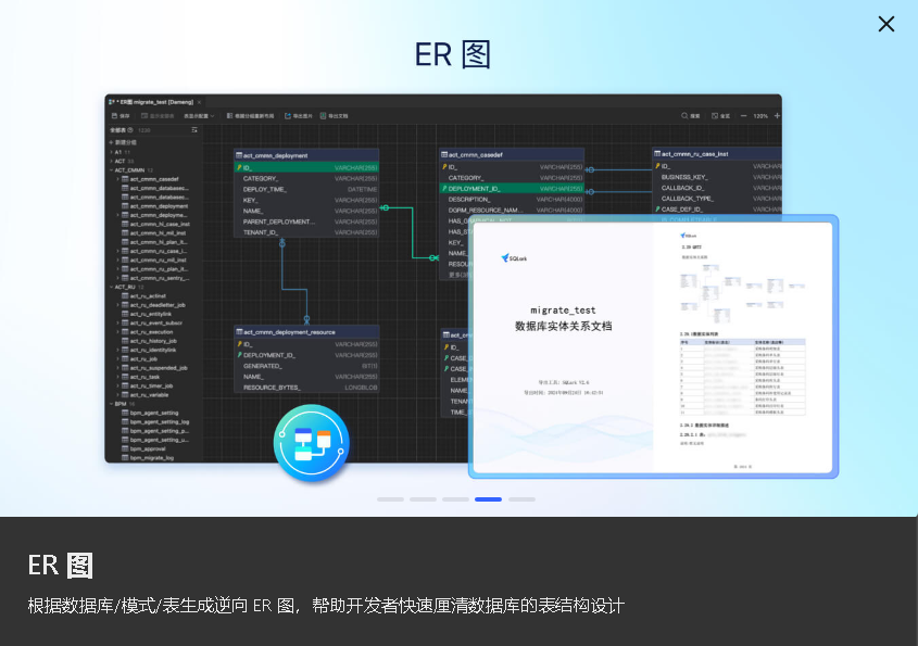 SQLark 提供了对多种数据库的连接支持,实现跨平台数据库管理的无缝切换;通过直观的可视化界面,轻松实现对模式、表、视图、物化视图、函数、存储过程、触发器、包等多种对象类型的增删改查。SQLark 内置的 SQL 编辑器,基于语法解析,集成智能提示、实时语法检查及语法高亮等功能,提升编写 SQL 语句的效率与准确性;其直观的数据查看与编辑器,使用户能够直观地浏览数据内容并进行即时编辑。此外,SQLark 还集成了数据生成、数据迁移及 ER 图生成等特色功能,助力开发人员更加高效、安全地完成数据管理任务。