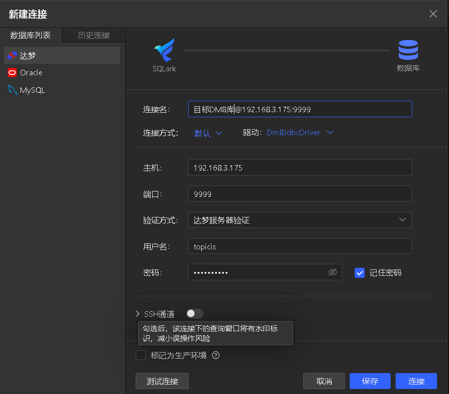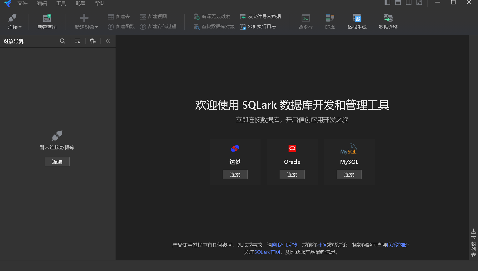 SQLark 是一款面向信创应用开发者的数据库开发和管理工具,用于快速查询、创建和管理不同类型的数据库系统,现已支持达梦、Oracle 和 MySQL 数据库。