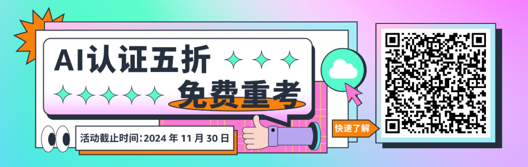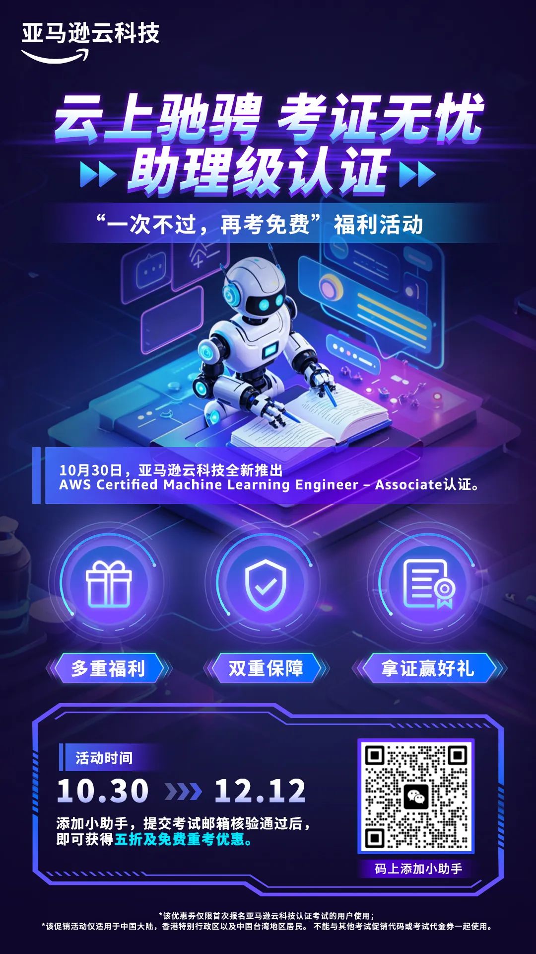 参加「云上驰骋 考证无忧」助理级认证系列活动,领取优惠券,多重保障,助您轻松获取AWS Certified Machine Learning Engineer – Associate认证,快速踏入人工智能的职业快车道。抓住成为生成式AI人才的绝佳机会,开启您的职业新篇章!