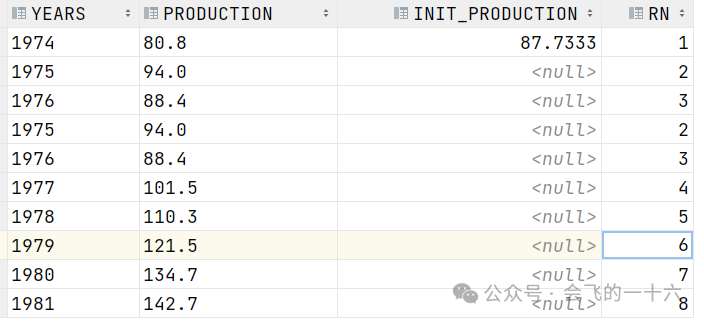 select years, production, last_value(init_production ignore nulls) over (order by YEARS) init_production, rnfrom (select years, production, casewhen rn = 1 then cast(avg(production)over (order by years rows between current row and 2 following ) as decimal(18, 1)) end init_production, rnfrom (select years, production, row_number() over (order by years) rnfrom production) t) t