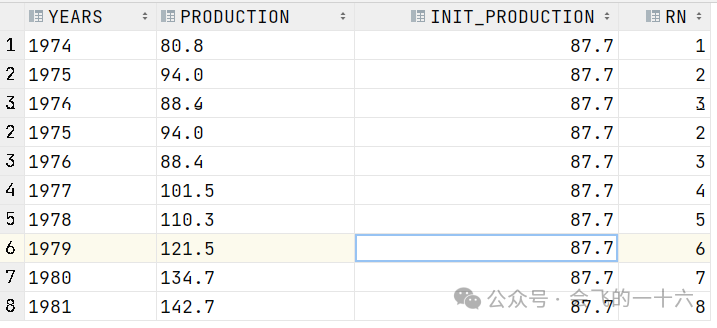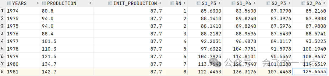 with init as (select years, production, last_value(init_production ignore nulls) over (order by YEARS) init_production, rnfrom (select years, production, casewhen rn = 1 then cast(avg(production)over (order by years rows between current row and 2 following ) as decimal(18, 1)) end init_production, rnfrom (select years, production, row_number() over (order by years) rnfrom production) t) t)--计算一次平滑值, s1 as (select t1.years, t1.production, t1.init_production, t1.rn, cast(sum(case when t2.rn <= t1.rn then t2.production * power(0.7, t1.rn - t2.rn) else 0 end) * 0.3 +power(0.7, t1.rn) * t1.init_production as decimal(18, 4)) s1_p3, cast(sum(case when t2.rn <= t1.rn then t2.production * power(0.4, t1.rn - t2.rn) else 0 end) * 0.6 +power(0.4, t1.rn) * t1.init_production as decimal(18, 4)) s1_p6from init t1,init t2group by t1.years, t1.production, t1.init_production, t1.rn)select *from s1order by YEARS;