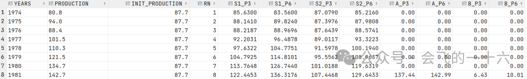 with init as (select years, production, last_value(init_production ignore nulls) over (order by YEARS) init_production, rnfrom (select years, production, casewhen rn = 1 then cast(avg(production)over (order by years rows between current row and 2 following ) as decimal(18, 1)) end init_production, rnfrom (select years, production, row_number() over (order by years) rnfrom production) t) t)--计算一次平滑值, s1 as (select t1.years, t1.production, t1.init_production, t1.rn, cast(sum(case when t2.rn <= t1.rn then t2.production * power(0.7, t1.rn - t2.rn) else 0 end) * 0.3 +power(0.7, t1.rn) * t1.init_production as decimal(18, 4)) s1_p3, cast(sum(case when t2.rn <= t1.rn then t2.production * power(0.4, t1.rn - t2.rn) else 0 end) * 0.6 +power(0.4, t1.rn) * t1.init_production as decimal(18, 4)) s1_p6from init t1,init t2group by t1.years, t1.production, t1.init_production, t1.rn)--计算二次平滑值, s2 as (select t1.years, t1.production, t1.init_production, t1.rn, t1.s1_p3, t1.s1_p6, cast(sum(case when t2.rn <= t1.rn then t2.s1_p3 * power(0.7, t1.rn - t2.rn) else 0 end) * 0.3 +power(0.7, t1.rn) * t1.init_production as decimal(18, 4)) s2_p3, cast(sum(case when t2.rn <= t1.rn then t2.s1_p6 * power(0.4, t1.rn - t2.rn) else 0 end) * 0.6 +power(0.4, t1.rn) * t1.init_production as decimal(18, 4)) s2_p6from s1 t1,s1 t2group by t1.years, t1.production, t1.init_production, t1.rn, t1.s1_p3, t1.s1_p6)select *from s2order by YEARS;