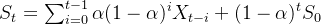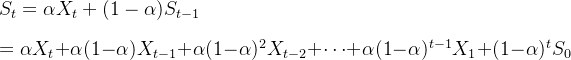 对上述迭代公式分析,我们可以看出指数平滑方法会将更大的权重赋到最近的观测值,对于更久远的观测值则会赋予较小的权重,权重的衰减速度由参