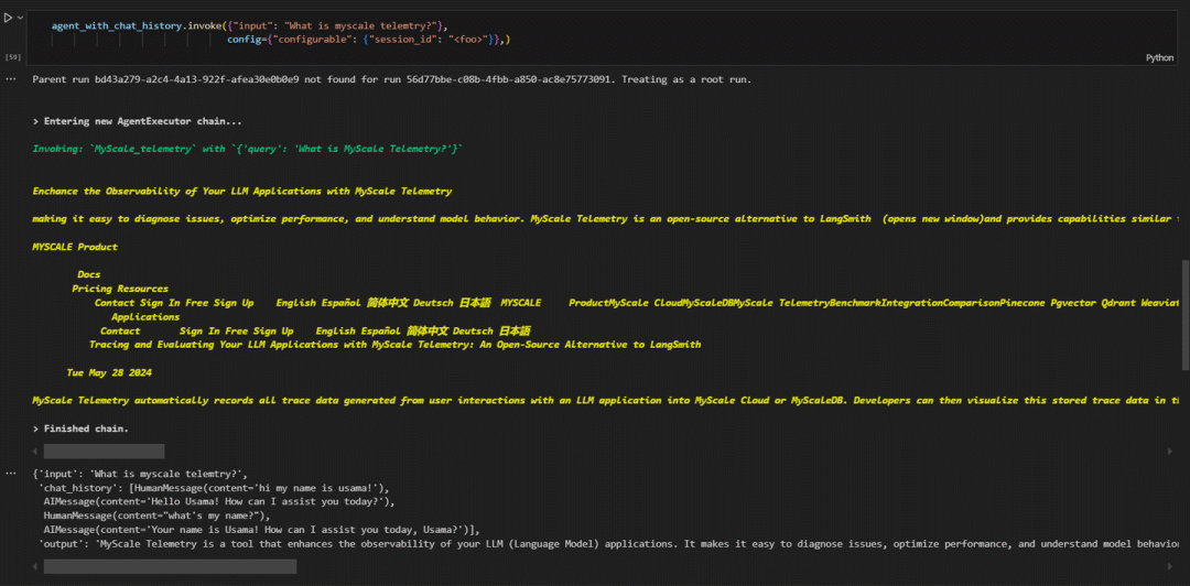 # 获取有关MyScale遥测的信息agent_executor.invoke({"input": "What's MyScale telemetry?"}, config={"configurable": {"session_id": "<foo>"}})