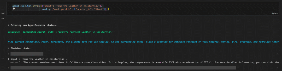 # 从网络获取信息agent_executor.invoke({"input": "How's the weather in California?"}, config={"configurable": {"session_id": "<foo>"}})