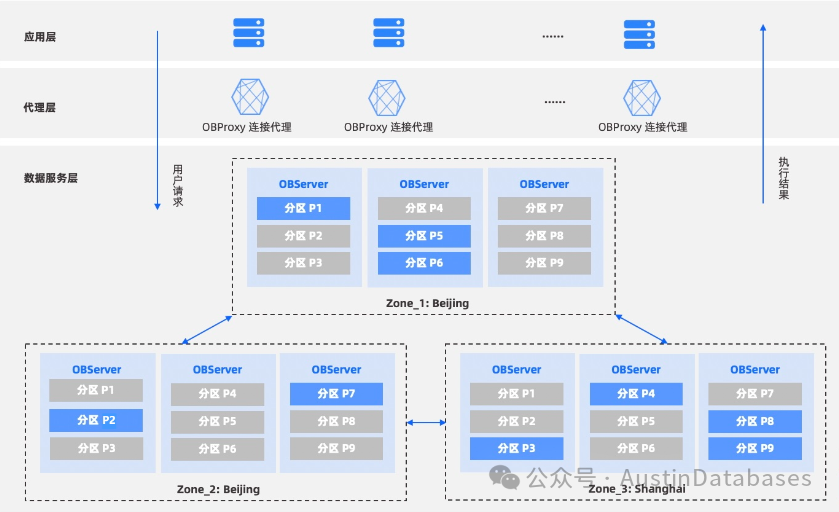 上图中一个OB的集群由三个子集群组成,每个子集群我们可以理解为是一个ZONE,一个OB的集群由上图中3个ZONE组成,一个节点OBSERVER可以存储多个分区的数据的分片,且每个数据都具有多个副本,分散在不同的ZONE中,确保数据的安全和可访问性。